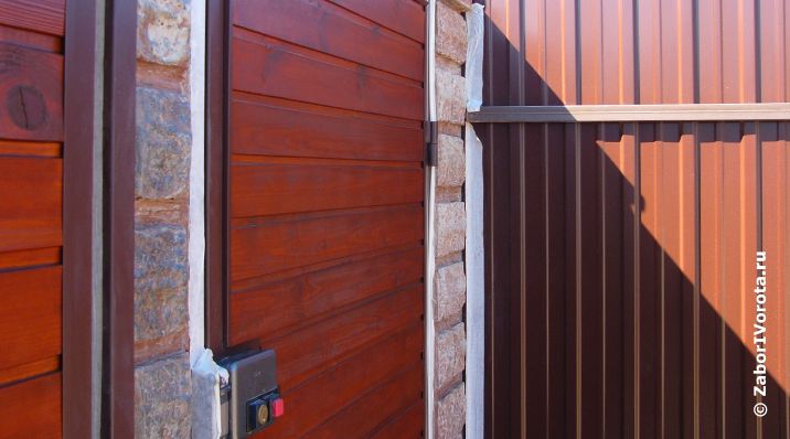 Откатные ворота прошли успешные тестовые испытания, после чего были сданы в эксплуатацию. Одновременно с воротами была установлена калитка, изготовленная с аналогичной конструкцией каркаса и деревянной обшивкой.