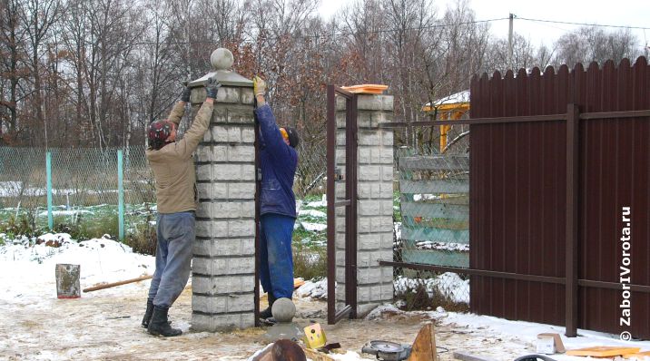 В качестве опорных столбов, в связи с тем, что опорные конструкции будут испытывать большие динамические и статические нагрузки, для ворот и калитки были использованы столбы из бетонных блоков ПРЕСТИЖ с декоративной поверхностью под колотый камень. Для защиты столбов от атмосферных осадков на них установлены бетонные колпаки ШАР. Кроме того, на опорных столбах были установлены приспособления для фиксации ворот в разных положениях – суппорт, ограничивающий полотно ворот в перпендикулярном направлении, нижний и верхний уловители, фиксирующие откатные ворота в закрытом состоянии.