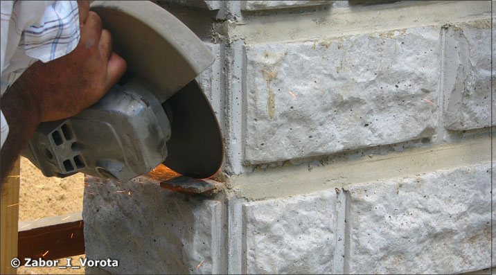 Для установки ворот шириной 6,5 метров и высотой 1,9 метра наши специалисты использовали готовые опорные столбы из блоков, которые были возведены в процессе установки забора. Надежность конструкции столбов предопределена их уникальным внутренним устройством: полое пространство, образующееся внутри декоративных заборных блоков, имитирующих натуральный камень, заполняется бетонным раствором. Изнутри бетонная конструкция усилена армирующей металлической трубой. Готовый столб представляет собой нерушимый монолит, в прочности которого сомневаться не приходится. Такие опоры способны выдержать очень большую нагрузку.