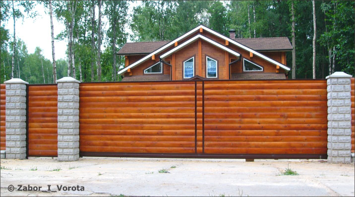 В качестве отделочного материала для обшивки забора, ворот и калитки со стороны фасада был использован блокхаус с шириной доски 145 мм. Для обшивки внутренней части ворот и калитки применена евровагонка из сосны класса ЭКСТРА. После тщательных обмеров из исходного материала с помощью циркулярной пилы были выполнены рабочие заготовки. Обшивка откатных ворот и калитки осуществлялась по инновационному принципу – элементов и деталей крепежа при тщательном осмотре не обнаружит даже специалист. Все деревянные поверхности были дважды окрашены защитным составом, предотвращающим гниение древесины, и предохраняющим ее от воздействия влаги и насекомых. Ворота и калитка с двусторонней деревянной обшивкой полностью повторили декоративное оформление всего комбинированного забора.