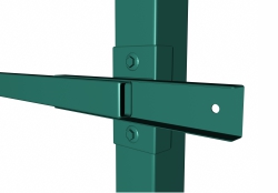 Крепеж для столба ворот 80х80 мм № 5 предназначен для удобного крепления лаги 20х40 мм к несущему столбу ворот и калиток из профильной трубы 80х80 мм. Крепежный элемент для столба выполнен из П-образного профиля толщиной 1,2 мм. К нему методом точечной сварки прикреплен профиль для лаги 20х40 мм. Держатель воротный окрашен порошковой краской, что служит гарантией его надежности и долговечности. Цвет порошковой окраски выбирается по каталогу RAL соответственно основному цвету ограждения. Крепеж монтируют к воротному столбу следующим образом: болтами или саморезами к столбу фиксируют держатель, затем в горизонтальную его часть вставляют лагу и закрепляют саморезами. Такое соединение мало уступает по прочности сварным швам, но уход за ним намного проще: сварные соединения нуждаются в регулярном подкрашивании для защиты от коррозии, а крепеж, окрашенный порошковыми красками, в уходе не нуждается. Крепеж можно легко демонтировать в случае необходимости, например, при расширении проема ворот и использовать снова.