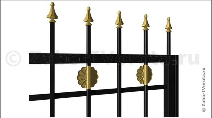 конструкцию завершают литые пики и изящные розетки. Створки ворот навешиваются