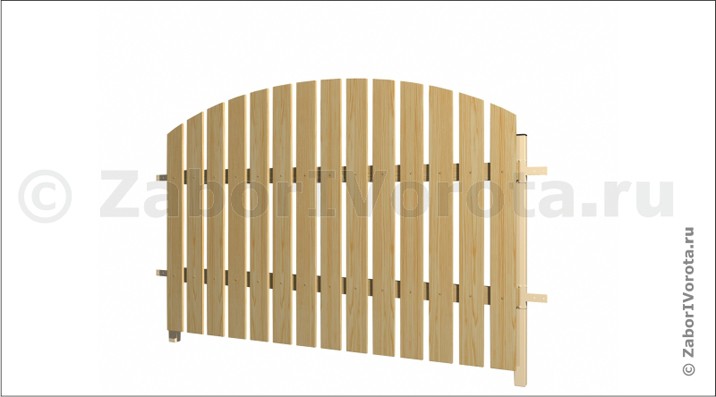 Деревянный сплошной забор Волна-7 производится из строганной доски хвойных пород в виде комплектующих. Толщина доски составляет 20 мм, ширина 95 мм. Верхняя кромка секции выполнена в виде волны. Планки штакетника в секции установлены с зазором 40 мм.