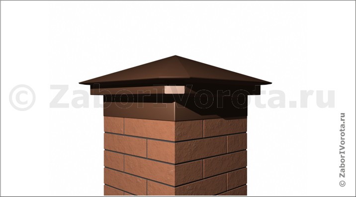 Металлические колпаки на столбы забора являются конструктивным элементом ограждения со столбами из кирпича или заборных блоков и служат для защиты столбов забора от погодных факторов, разрушающих столб. Колпаки изготавливаются из оцинкованной стали с цветным полимерным покрытием. Свои защитные свойства они приобретают благодаря выступающим краям - свесам. Колпак изготавливается из цельного металлического листа и состоит из двух частей. Нижняя часть (юбка) надевается на столб забора, защищая его от проникновения влаги, верхняя часть (зонт) благодаря выступающим краям – свесам, отводит воду от кладки столба. Внутренний фальцевый шов делает колпаки непроницаемыми для осадков и придает необходимую жесткость конструкции.
